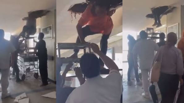 El ascensor falló y se quedaron atrapados pacientes entre los pisos. Tuvieron que ser desalojados por medio de este hueco que hicieron en la tablaroca.