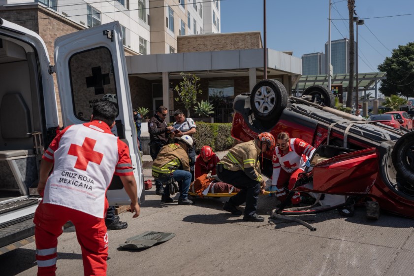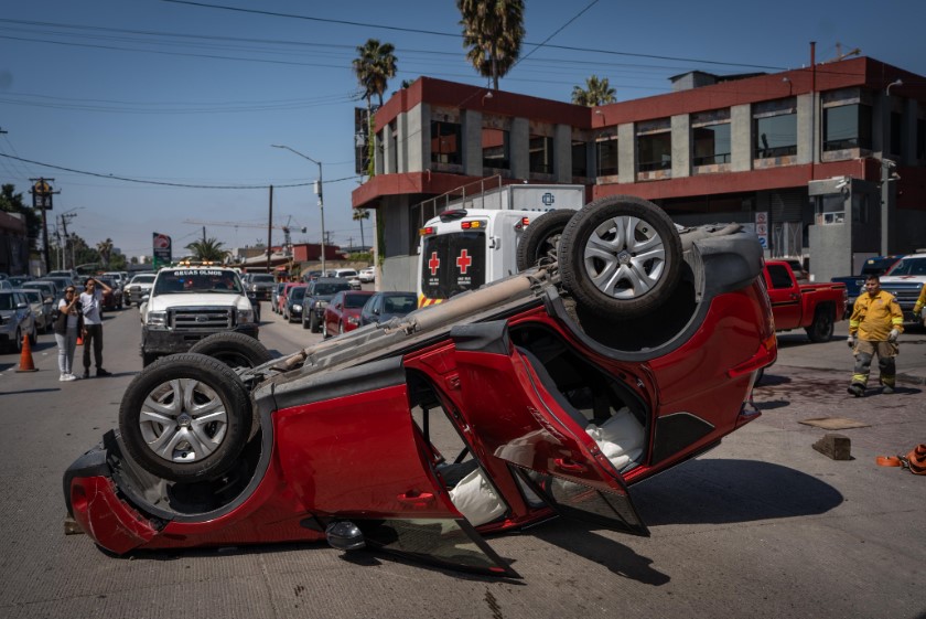Una mujer de aproximadamente 55 años quedó atrapada en su camioneta Toyota RAV4 roja con placas de California, luego de volcarse sobre el bulevar Agua Caliente en dirección a Las Torres, a la altura de la plaza Chapultepec.