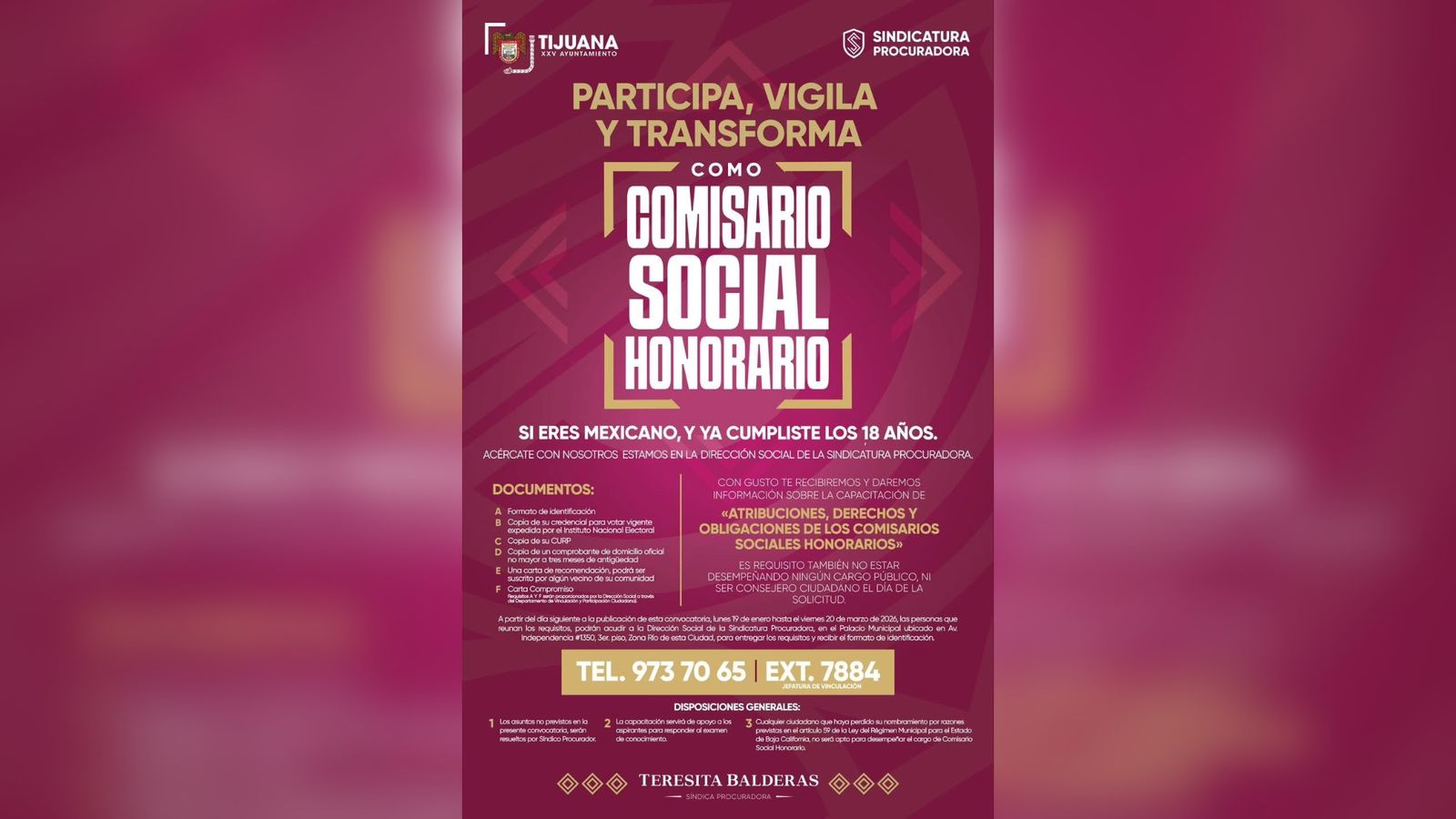 Sindicatura Procuradora del Ayuntamiento de Tijuana anunció el arranque de la segunda convocatoria 2026 para Comisarios Sociales Honorarios, la cual estará vigente del lunes 26 de enero al 20 de marzo.