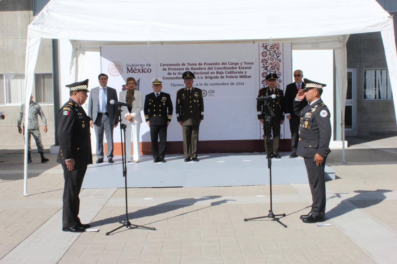 Durante la ceremonia se realizó la lectura del currículum del nuevo comandante, su protesta de bandera y los honores correspondientes, reafirmando su compromiso con la seguridad y la coordinación estatal en Baja California.