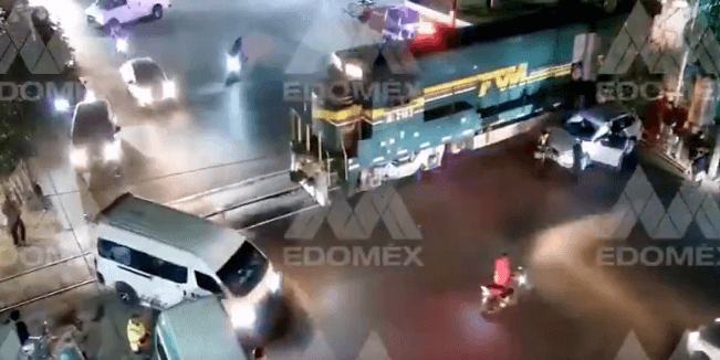 Un video de las cámaras de la Secretaría de Seguridad del Estado de México, muestra el momento exacto en el que una camioneta avanza a toda velocidad en un intento por ganarle al tren, sin embargo, no logró evadirlo y terminó siendo embestido y arrastrado algunos metros.